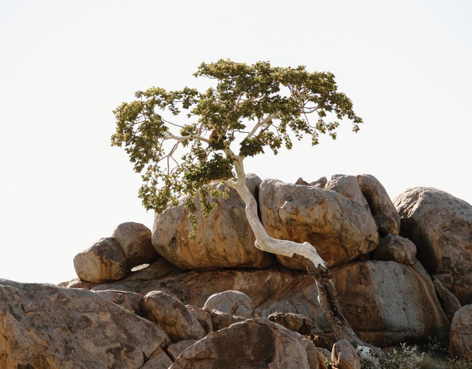 Clear cobalt skies stretch above white, willowy grasslands. Rocky peaks rise among scattered shrubs. Solitary gravel roads are occasionally interrupted by capacious, sandy riverbeds. Here, the wilderness opens to sweeping plains, filled with mopane woodlands and dotted with hardy shepherd’s trees sculpted by the wind. Along the way, we encounter scenes of daily, rural life: sheep and goat herders, small farming settlements, and roadside stalls selling rough cuts of quartz and semi-precious gemstones. As we venture further into the semiarid terrain of Damaraland, the landscape begins to transform, with both the vegetation and its inhabitants adapting to the region’s rugged geography.