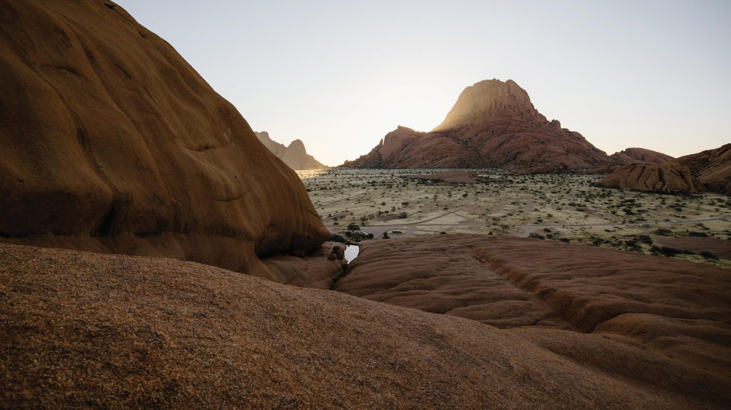 In the western reaches of the Erongo Region, a flat expanse of semi-desert savannah extends northwards, where the otherwise unbroken horizon is crowned by the unmistakable craggyshaped domes of the Spitzkoppe. Spitzkoppe, a granite inselberg often nicknamed the “Matterhorn of Namibia” for its pointed, jagged profile, stretches 600 to 700 metres above the Namib plains. Forged by time from the eroded remnants of an ancient subterranean mass of solidified lava – much like the Brandberg and Erongo mountains – it is estimated to be more than 120 million years old. The tallest of its many outcrops stands at 1,728 metres above sea level.